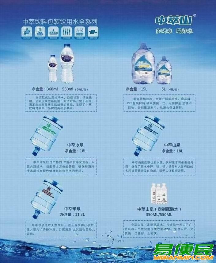 扬州中萃山泉桶装水,全扬州市区覆盖配送,包装饮用水品类规格齐全,桶装水、瓶装水、定制水